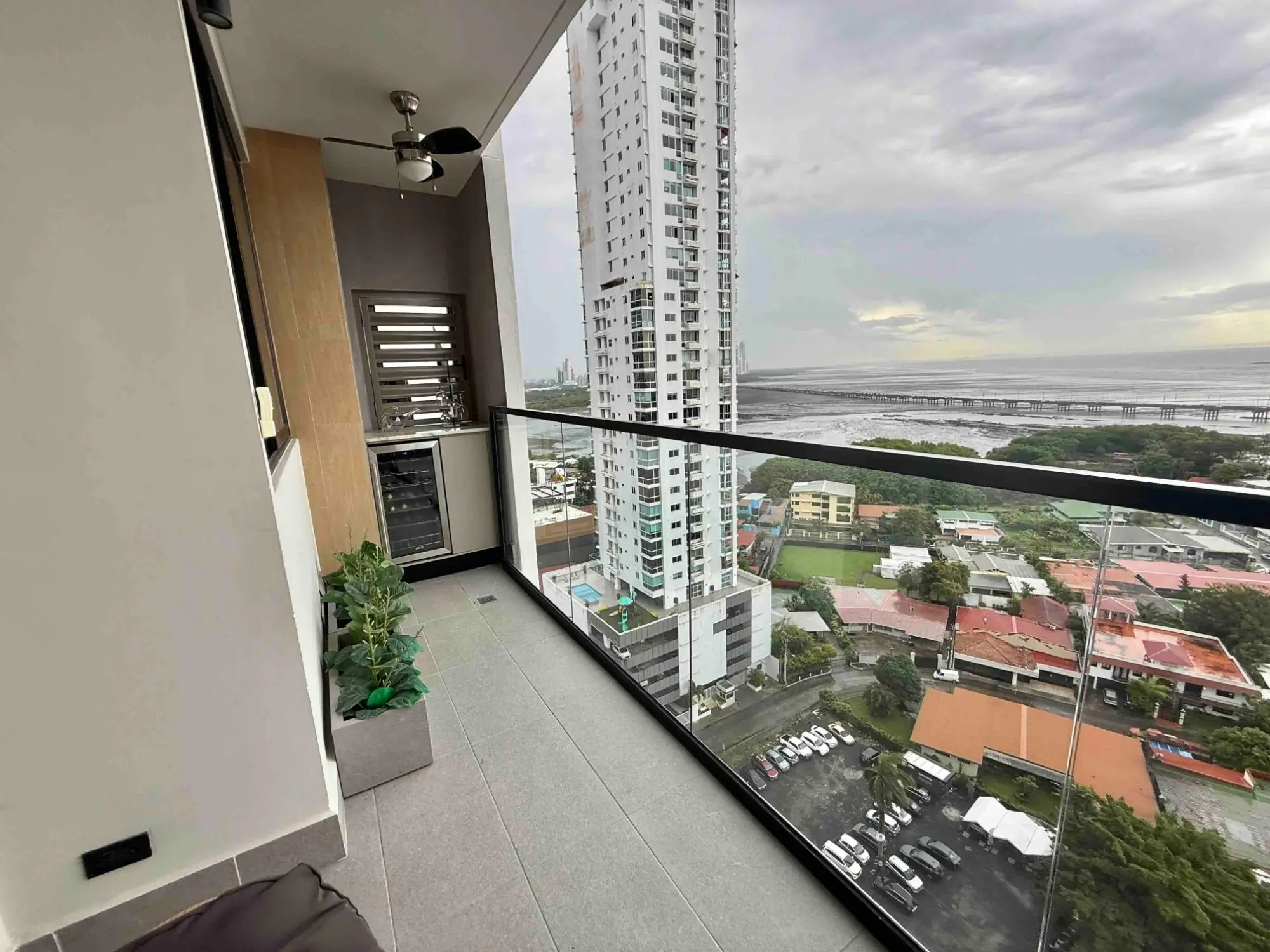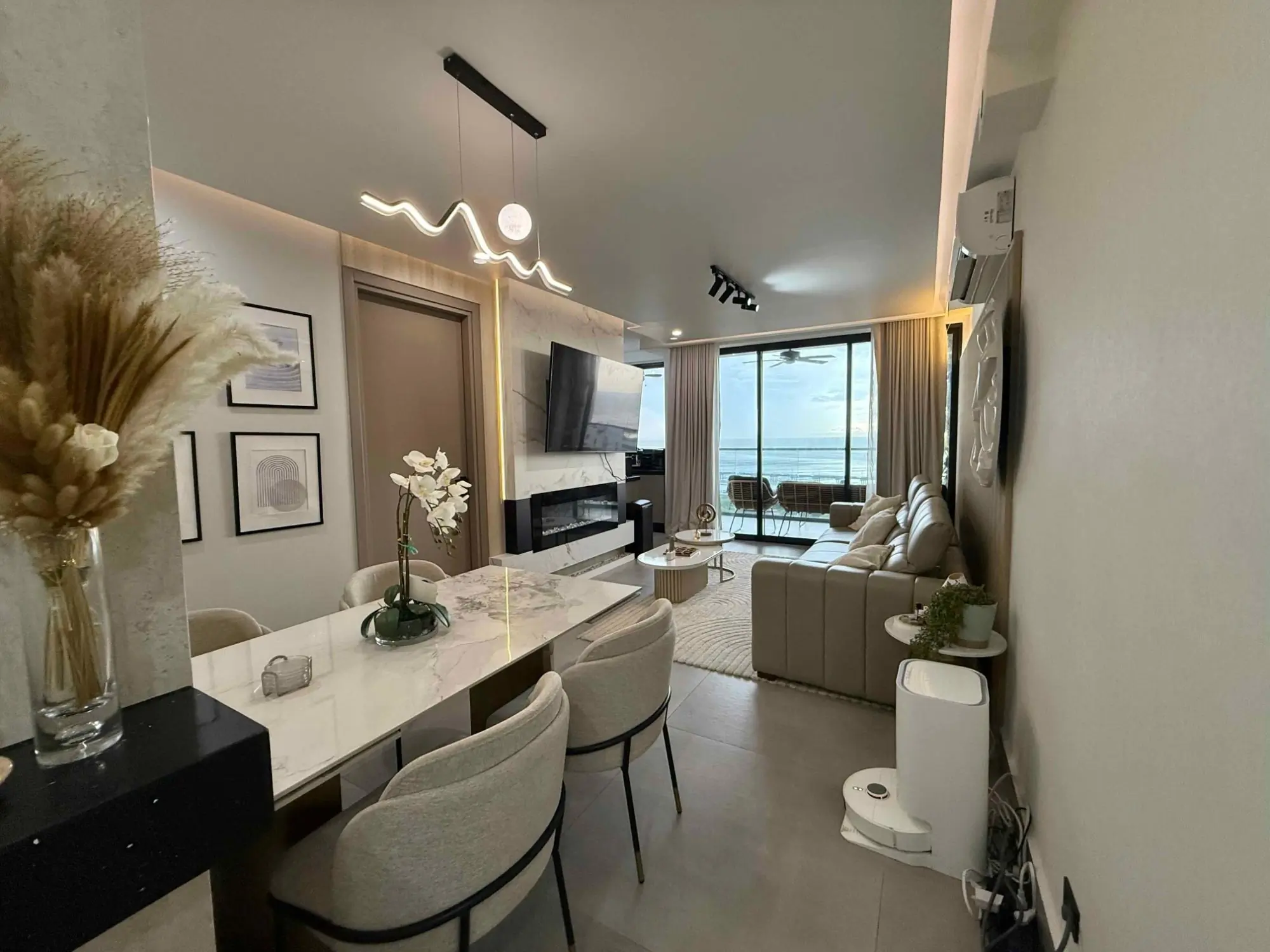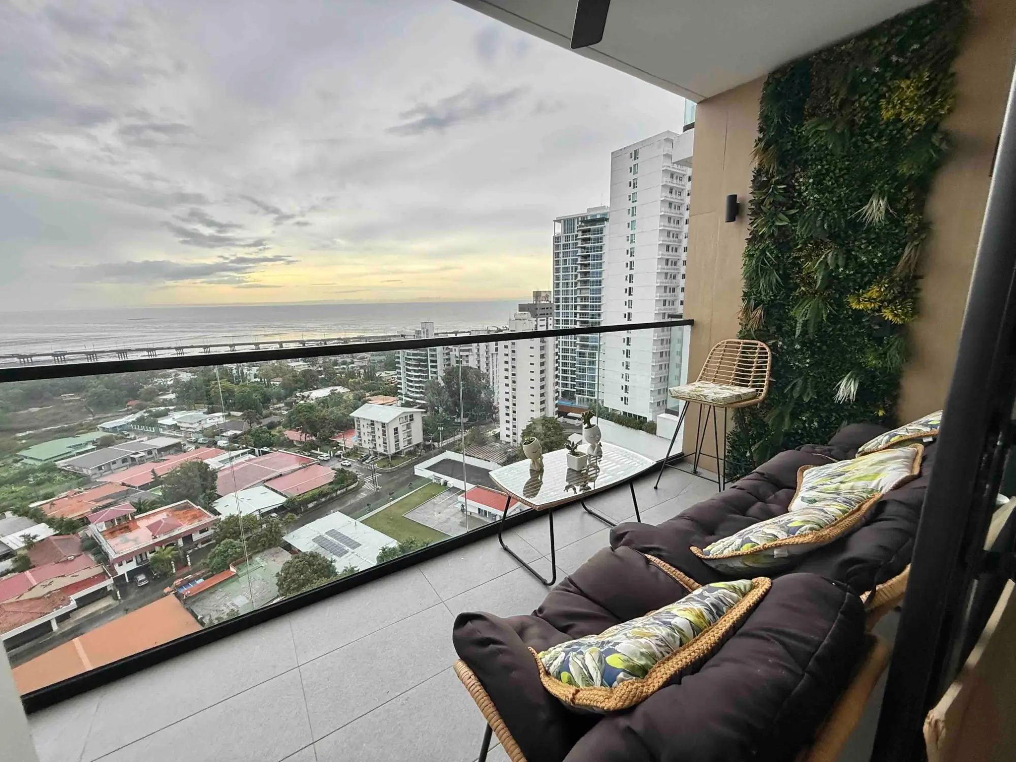 Este apartamento cuenta con 3 recamaras, 2 baños, cocina, sala – comedor, balcon con vista al mar, 2 estacionamientos, y un deposito. El edificio fue construido hace 3 años, y cuenta con numerosas amenidades como piscina exterior, gimnasio, pista de correr, cancha de tenis, spa, sala de cine, cuarto de juegos, salon de billar, area social cerrada y de coworking.