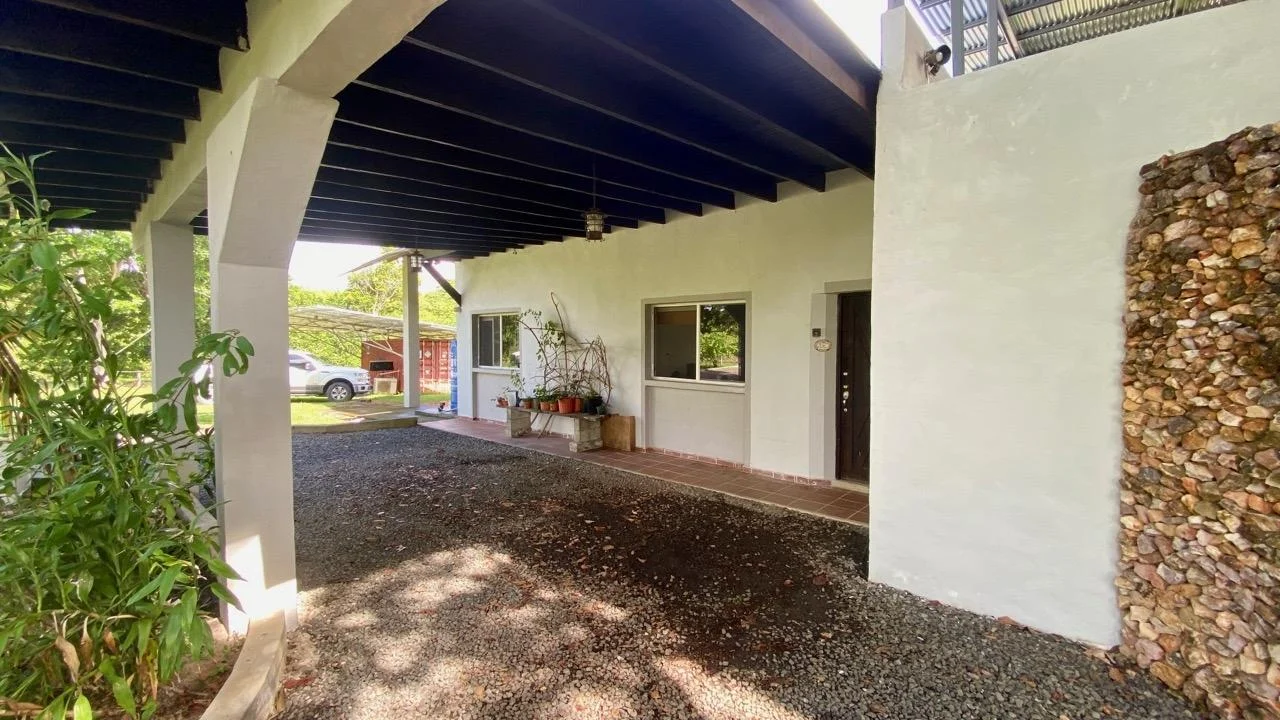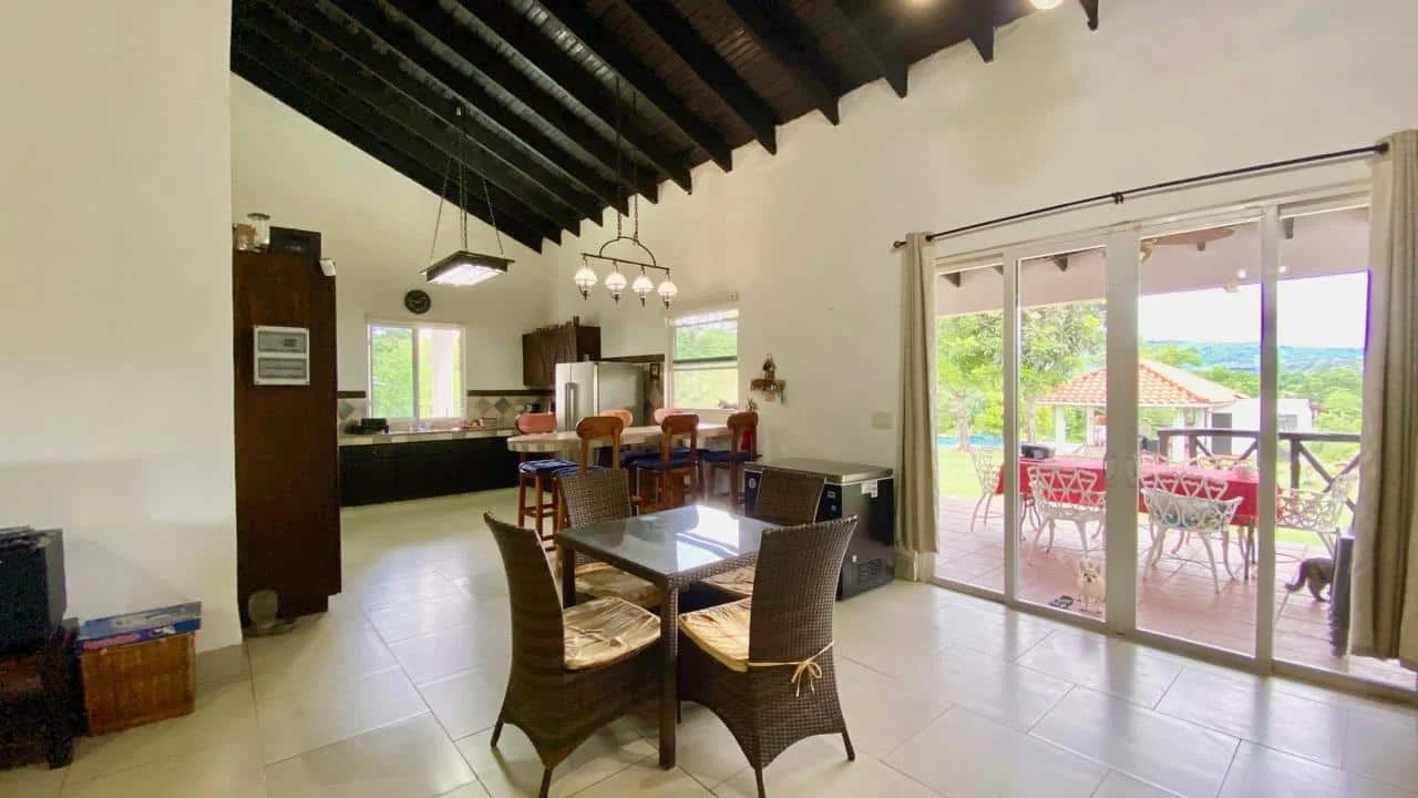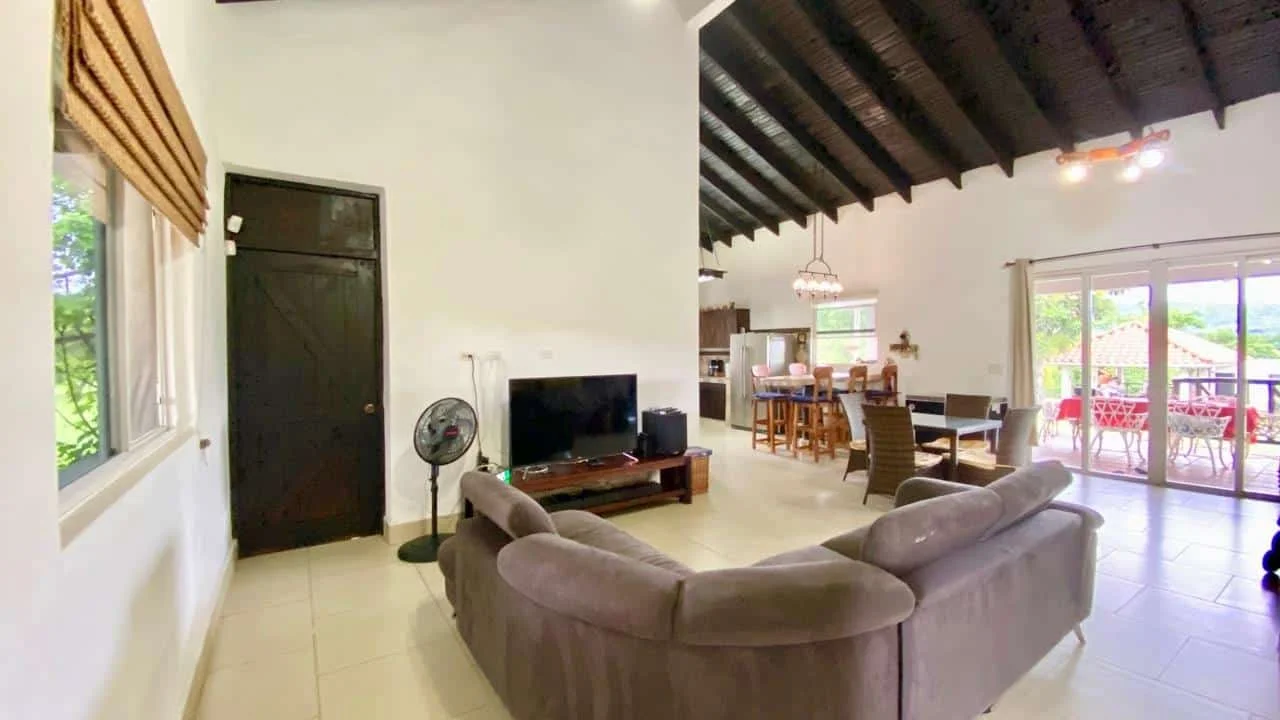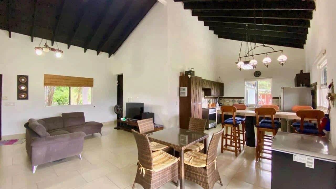 Casa estilo colonial de tres dormitorios con linda piscina y un amplio terreno ajardinado, a solo 10 minutos de Coronado. Esta casa de tres dormitorios se encuentra en el complejo Las Quintas de Cabuya, camino al pueblo de Cabuya. Es un complejo muy acogedor con aproximadamente 20 casas, rodeado de montañas. Ofrece vistas preciosas y una agradable brisa durante todo el año. Tiene una pequeña área social con piscina y bohíos de penca. La casa estilo colonial de tres dormitorios tiene los techos altos y hechos de madera maciza oscura, muy elegante. La construcción es de 2014. Con una superficie aproximada de 200m2 y 3400m2 de jardín con abundantes árboles frutales, esta propiedad goza de una ubicación privilegiada, al final de una calle sin salida. • Amplio salón con acceso a la terraza. • Cocina abierta, amueblada y equipada, con comedor. • Primer dormitorio con baño privado y entrepiso, aire acondicionado y ventilador de techo. • Segundo dormitorio, también con baño privado, aire acondicionado y ventilador de techo. • Tercer dormitorio, aire acondicionado y ventilador de techo. • Baño independiente con sanitario. • Terraza cubierta con vistas al patio trasero, la piscina y las montañas circundantes. • Baño exterior, lateral a la terraza. • Piscina y amplio bohío con cocina exterior, horno de ladrillo, baño completo y amplio almacén. • Lavandería. • Deposito de jardín. • Mirador de 60 metros cuadrados con agua y electricidad. • Amplias plazas de aparcamiento. • OPCIONAL FULL SISTEMA SOLAR 55,000 USD Contenedor refrigerado y aislado de 20 pies con paneles solar, baterías y controles. El jardín de 3400 m2 está completamente ajardinado, con árboles frutales (papaya, piña, mango, plátano, coco, guanábana, limón, naranja y mandarina). Las vistas son despejadas y ofrecen linda vistas de las montañas circundantes. Además, una agradable brisa recorre la propiedad durante todo el año. Esta casa estilo colonial de tres dormitorios es una excelente opción para quienes buscan una vivienda con espacio suficiente para toda la familia en un vecindario tranquilo y seguro. Opcional, el sistema solar es muy eficiente, con una gran capacidad de almacenamiento de energía suficiente para toda la casa. Le seducirá por su distribución funcional, sus altos techos de madera estilo catedral, su estado general y la tranquilidad del lugar. Además, se beneficiará de una exención de impuesto hasta el 2034.