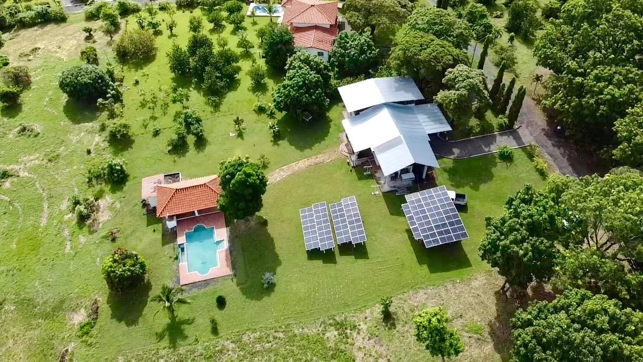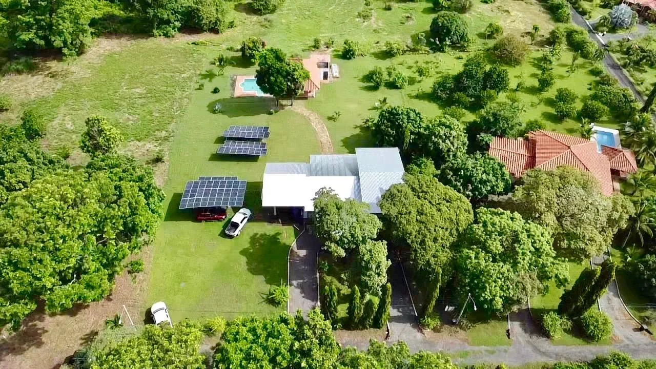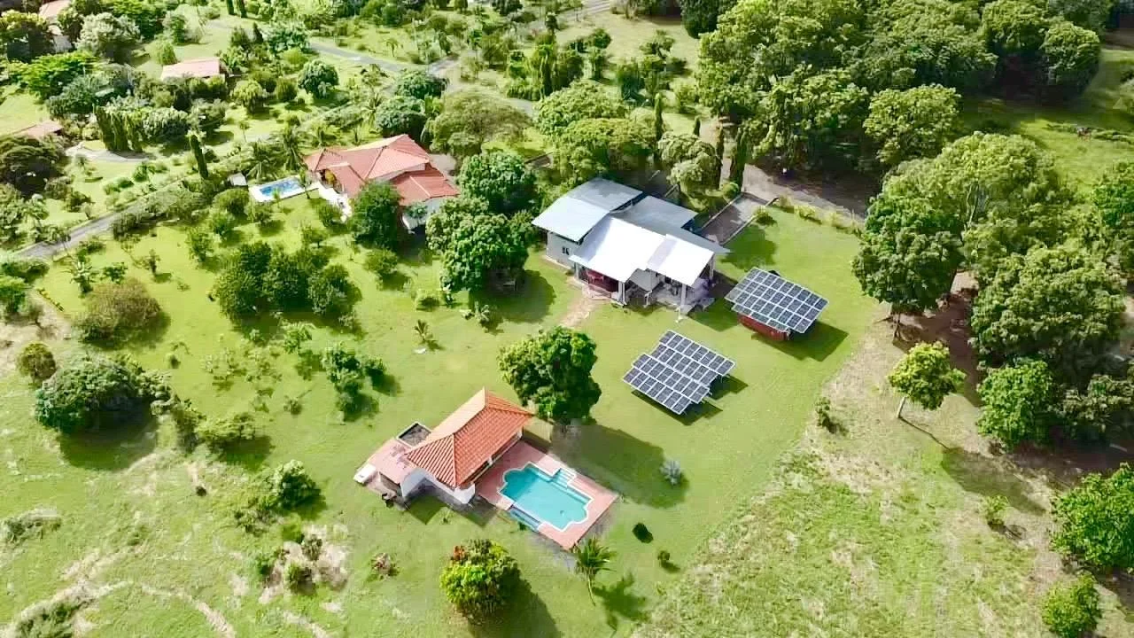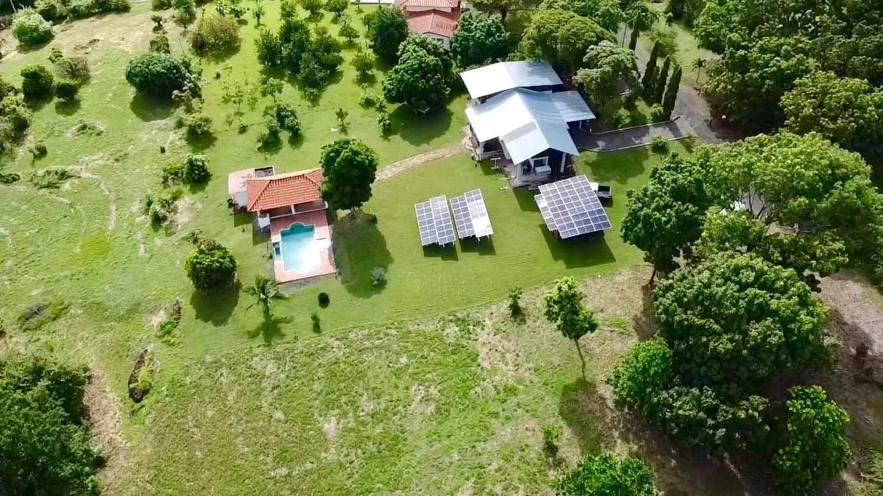 Casa estilo colonial de tres dormitorios con linda piscina y un amplio terreno ajardinado, a solo 10 minutos de Coronado. Esta casa de tres dormitorios se encuentra en el complejo Las Quintas de Cabuya, camino al pueblo de Cabuya. Es un complejo muy acogedor con aproximadamente 20 casas, rodeado de montañas. Ofrece vistas preciosas y una agradable brisa durante todo el año. Tiene una pequeña área social con piscina y bohíos de penca. La casa estilo colonial de tres dormitorios tiene los techos altos y hechos de madera maciza oscura, muy elegante. La construcción es de 2014. Con una superficie aproximada de 200m2 y 3400m2 de jardín con abundantes árboles frutales, esta propiedad goza de una ubicación privilegiada, al final de una calle sin salida. • Amplio salón con acceso a la terraza. • Cocina abierta, amueblada y equipada, con comedor. • Primer dormitorio con baño privado y entrepiso, aire acondicionado y ventilador de techo. • Segundo dormitorio, también con baño privado, aire acondicionado y ventilador de techo. • Tercer dormitorio, aire acondicionado y ventilador de techo. • Baño independiente con sanitario. • Terraza cubierta con vistas al patio trasero, la piscina y las montañas circundantes. • Baño exterior, lateral a la terraza. • Piscina y amplio bohío con cocina exterior, horno de ladrillo, baño completo y amplio almacén. • Lavandería. • Deposito de jardín. • Mirador de 60 metros cuadrados con agua y electricidad. • Amplias plazas de aparcamiento. • OPCIONAL FULL SISTEMA SOLAR 55,000 USD Contenedor refrigerado y aislado de 20 pies con paneles solar, baterías y controles. El jardín de 3400 m2 está completamente ajardinado, con árboles frutales (papaya, piña, mango, plátano, coco, guanábana, limón, naranja y mandarina). Las vistas son despejadas y ofrecen linda vistas de las montañas circundantes. Además, una agradable brisa recorre la propiedad durante todo el año. Esta casa estilo colonial de tres dormitorios es una excelente opción para quienes buscan una vivienda con espacio suficiente para toda la familia en un vecindario tranquilo y seguro. Opcional, el sistema solar es muy eficiente, con una gran capacidad de almacenamiento de energía suficiente para toda la casa. Le seducirá por su distribución funcional, sus altos techos de madera estilo catedral, su estado general y la tranquilidad del lugar. Además, se beneficiará de una exención de impuesto hasta el 2034.
