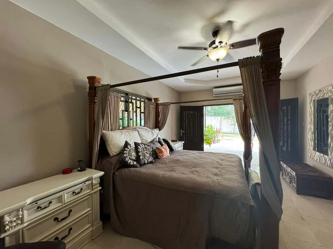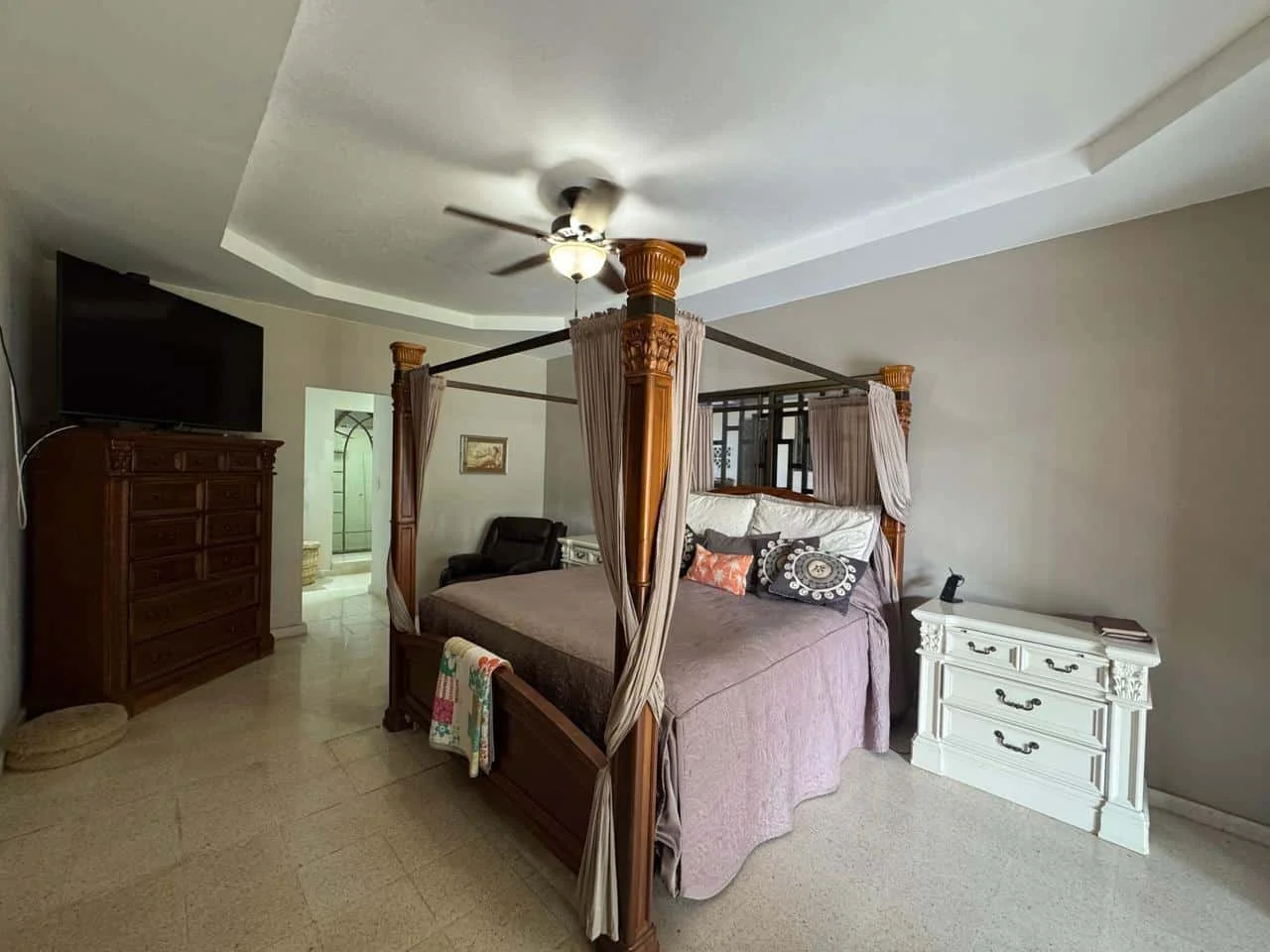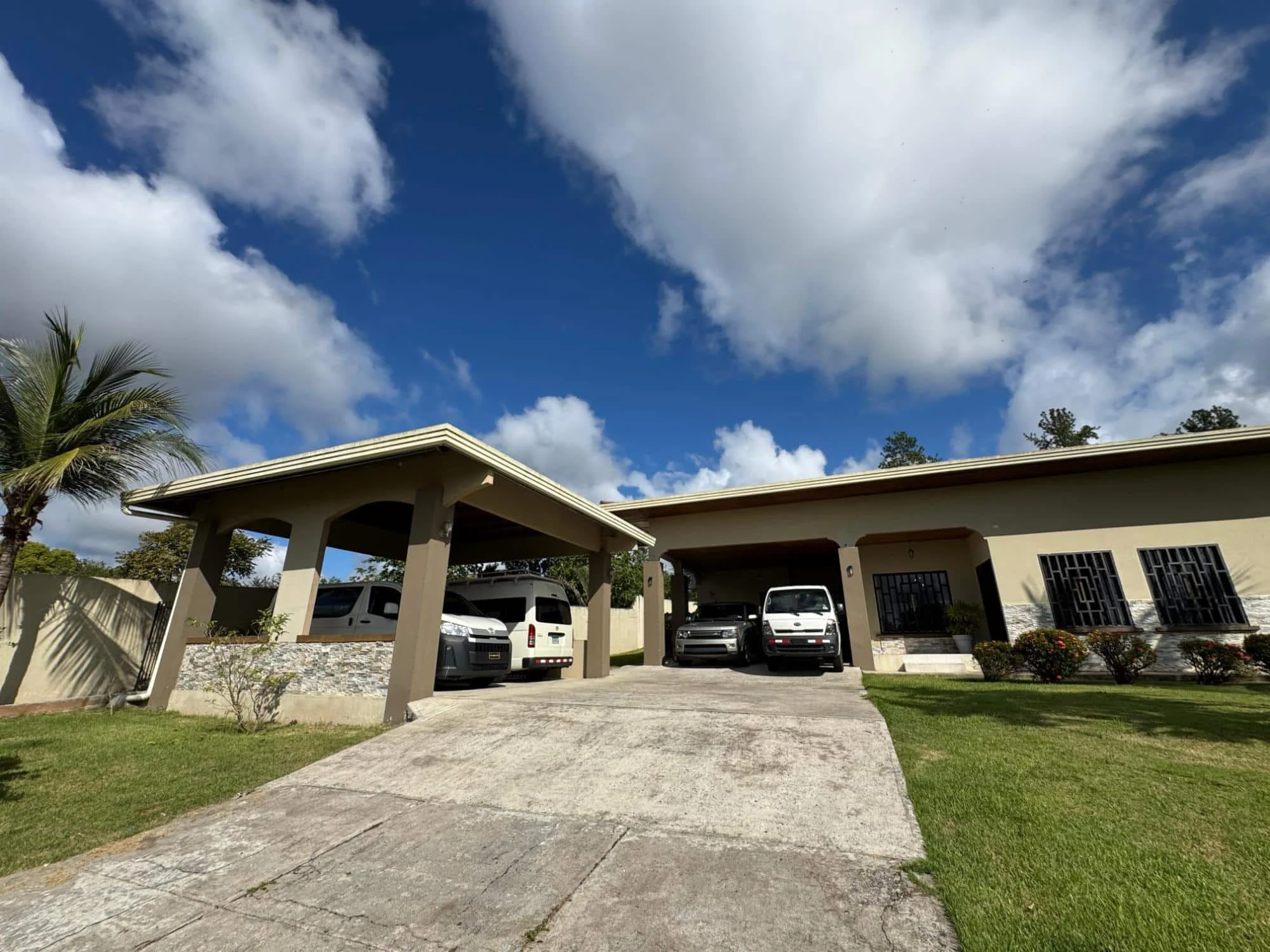 Casa unifamiliar con aproximadamente 300 m² de construcción en un terreno plano de 2.239,52 m² en Santiago, Veraguas. Cuatro dormitorios, cuatro baños, piscina, áreas interiores y exteriores definidas, cerca perimetral y acceso controlado. Ubicada a unos 2 minutos de la Carretera Interamericana y a aproximadamente 5 minutos del centro comercial de Santiago. La casa no está directamente adyacente a la carretera. La casa – Distribución interior La casa presenta una distribución funcional con pisos de granito en toda la casa. La sala de estar principal cuenta con un techo con paneles de madera y recibe luz natural, conectando directamente con el comedor y la cocina. Estos espacios forman el área de estar central de la casa. La cocina cuenta con encimeras de granito, gabinetes superiores e inferiores de madera maciza, una estufa de acero inoxidable, una campana extractora y una gran despensa. También incluye bancos para cuatro personas y un comedor secundario que se abre hacia la sala de estar. Dormitorios y baños La propiedad incluye cuatro dormitorios y cuatro baños. Dos de los dormitorios funcionan como suites principales. La suite principal mide aproximadamente 6,35 m x 3,85 m e incluye un techo con incrustaciones, puertas francesas dobles que dan directamente a un patio exterior y vestidores independientes. El baño en suite incluye dos lavabos, una ducha extragrande y una bañera profunda. La segunda suite principal ofrece espacio para una cama king size, luz natural y baño privado con ducha extragrande. Dos dormitorios adicionales se encuentran en una sección separada de la casa. Dos de los dormitorios cuentan con baños de tres cuartos independientes con duchas.