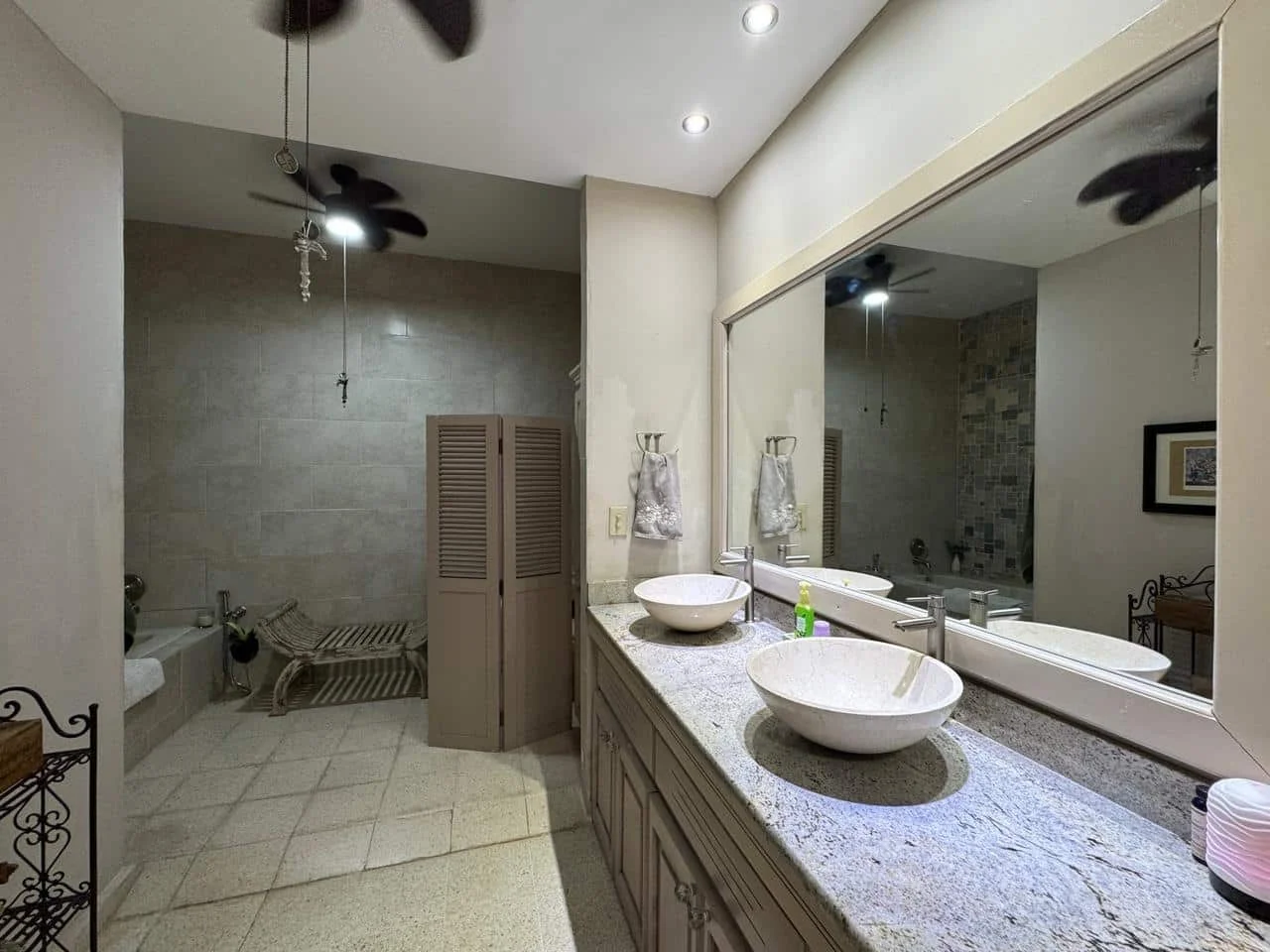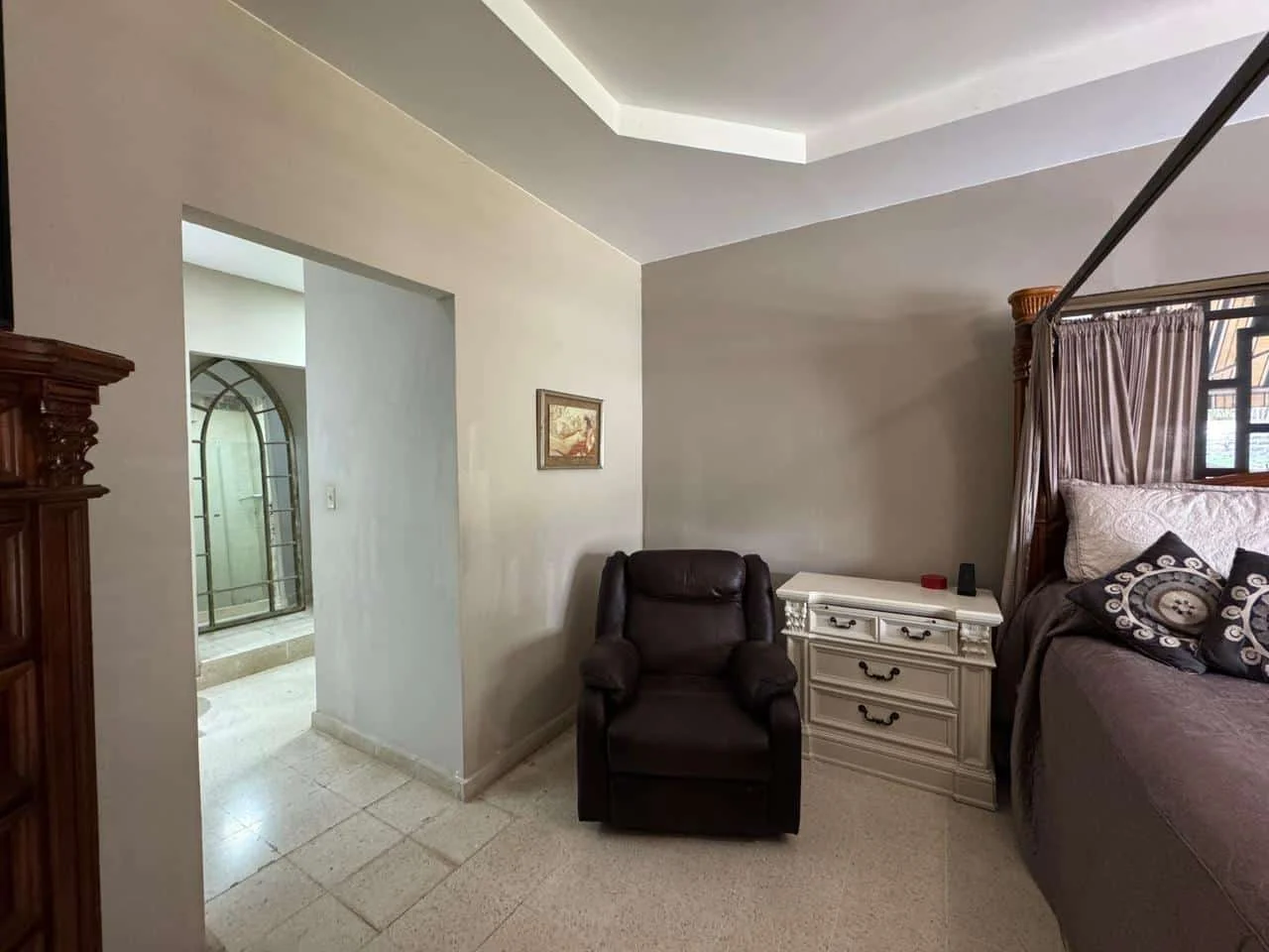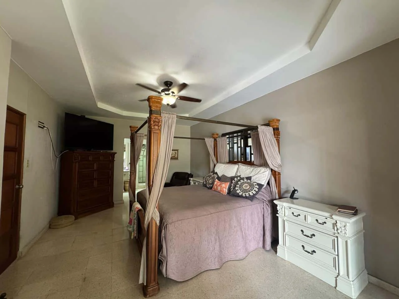 Casa unifamiliar con aproximadamente 300 m² de construcción en un terreno plano de 2.239,52 m² en Santiago, Veraguas. Cuatro dormitorios, cuatro baños, piscina, áreas interiores y exteriores definidas, cerca perimetral y acceso controlado. Ubicada a unos 2 minutos de la Carretera Interamericana y a aproximadamente 5 minutos del centro comercial de Santiago. La casa no está directamente adyacente a la carretera. La casa – Distribución interior La casa presenta una distribución funcional con pisos de granito en toda la casa. La sala de estar principal cuenta con un techo con paneles de madera y recibe luz natural, conectando directamente con el comedor y la cocina. Estos espacios forman el área de estar central de la casa. La cocina cuenta con encimeras de granito, gabinetes superiores e inferiores de madera maciza, una estufa de acero inoxidable, una campana extractora y una gran despensa. También incluye bancos para cuatro personas y un comedor secundario que se abre hacia la sala de estar. Dormitorios y baños La propiedad incluye cuatro dormitorios y cuatro baños. Dos de los dormitorios funcionan como suites principales. La suite principal mide aproximadamente 6,35 m x 3,85 m e incluye un techo con incrustaciones, puertas francesas dobles que dan directamente a un patio exterior y vestidores independientes. El baño en suite incluye dos lavabos, una ducha extragrande y una bañera profunda. La segunda suite principal ofrece espacio para una cama king size, luz natural y baño privado con ducha extragrande. Dos dormitorios adicionales se encuentran en una sección separada de la casa. Dos de los dormitorios cuentan con baños de tres cuartos independientes con duchas.