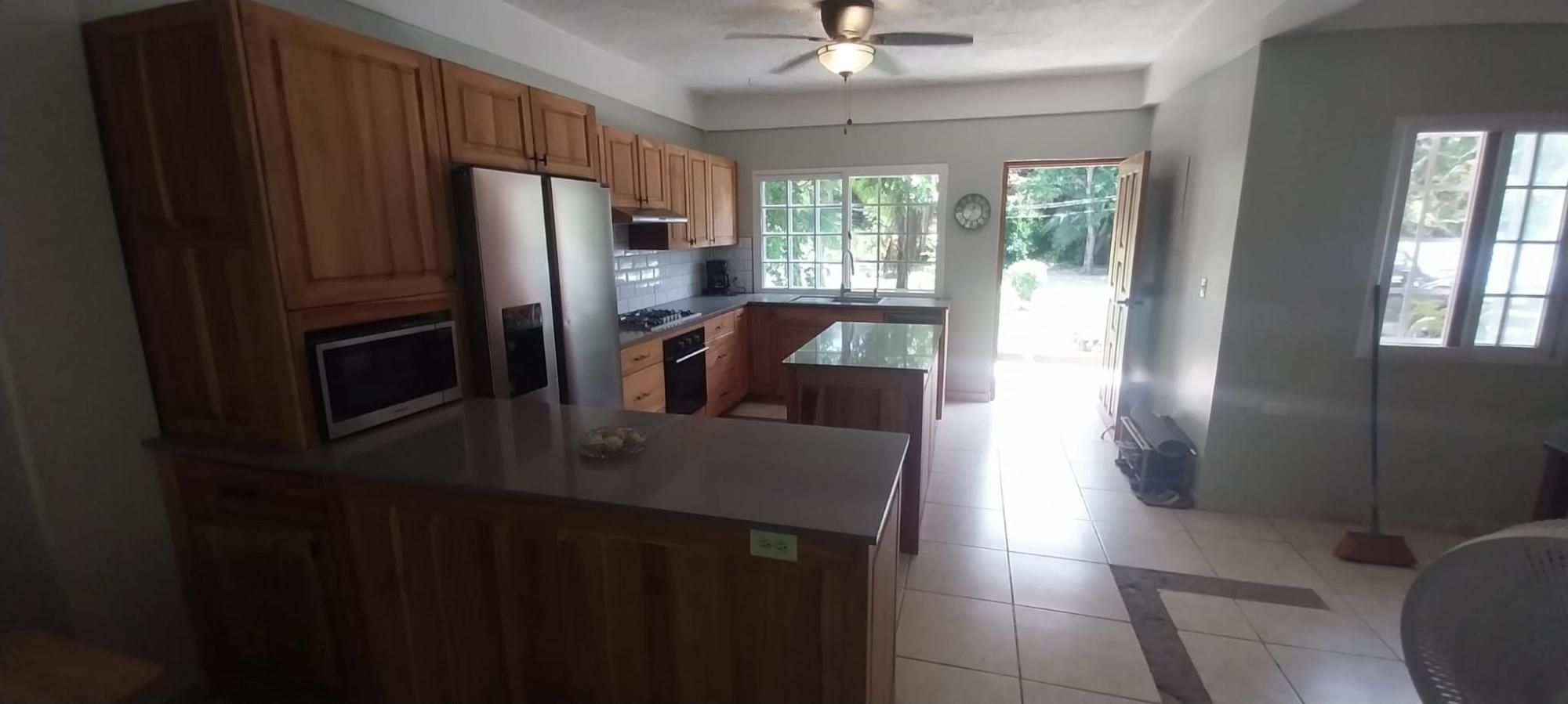 Casa de Playa Remodelada con Cocina de Teca a Medida, 4 Dormitorios y 3.5 Baños, Ubicada a Solo 300 Metros de la Playa en Puerto Armuelles, Panamá. Cocina y Sala de Estar. Esta propiedad cuenta con una cocina recientemente remodelada con gabinetes de teca a medida, ofreciendo un espacio de cocina funcional y acogedor. Los electrodomésticos de cocina tienen solo un año de antigüedad, agregando eficiencia moderna a la casa. La casa incluye cuatro dormitorios, tres baños y medio, y una sala familiar, brindando amplio espacio para la familia o invitados. Dos de los dormitorios están equipados con unidades de aire acondicionado para mayor comodidad. Construcción e Infraestructura. Construida con estructura de postes y vigas usando paredes de bloque M2 y un techo de zinc, la casa está diseñada para durabilidad en el entorno costero. Un sistema de filtración de agua en toda la casa está en su lugar, junto con un gran tanque de agua, lo que garantiza un suministro de agua confiable. El calentador de agua a gas de 30 galones satisface las necesidades constantes de agua caliente en toda la casa.