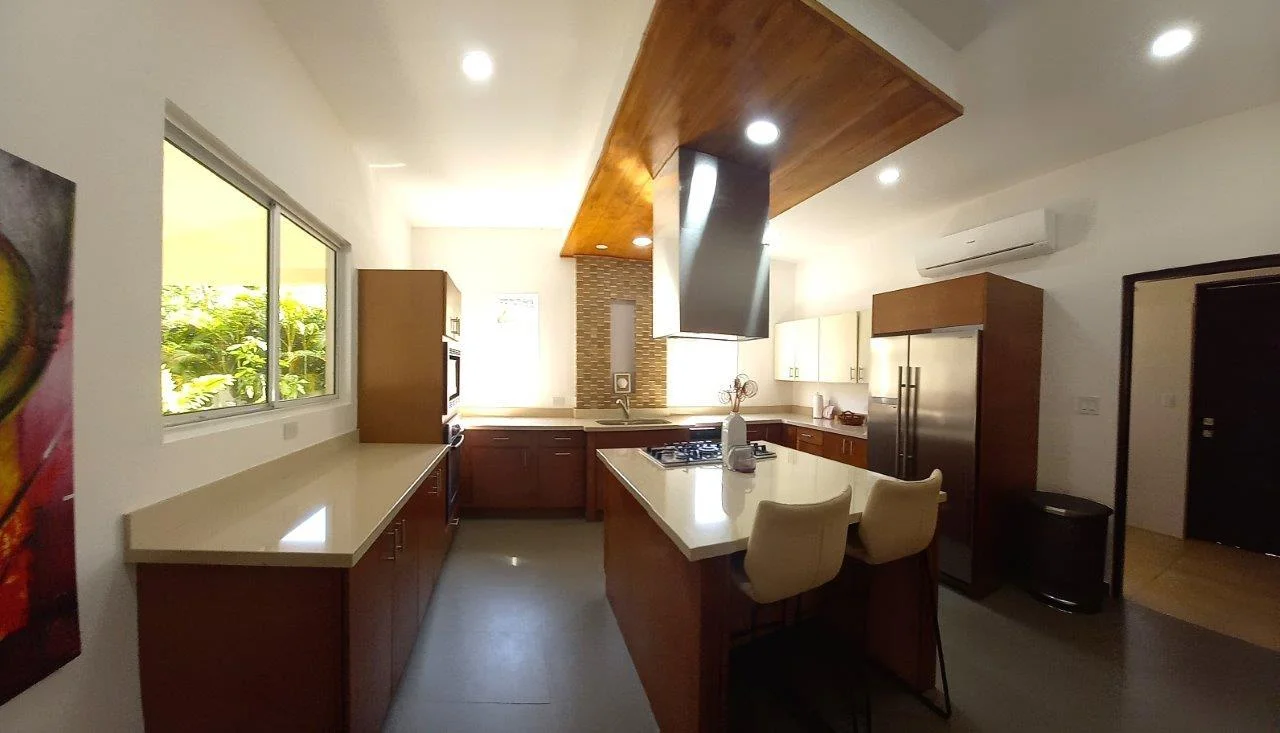 Costa Esmeralda Villa is nestled on a large lot on a cul de sac . Also, there are clear ocean view as well as beautiful views of huge mature trees. Very important, the beach is only 5 minutes’ walk on a private road. Furthermore, the back of the house faces southeast, hence, the pool receives a lot of morning sunlight. The big yard is mostly flat. You will enjoy your morning coffee by the large bohio while listening to the numerous birds flying over the property. Moreover, harvest your own lemons, your own papaya, and cilantro. There is plenty of space to plant more as well. Other Features: Updated kitchen with high-end appliance, Well Water, Search protector for the whole house, Care taker´s facility, Lighted Swimming pool, Large Jacuzzi, Spacious entertainment room, High ceiling throughout, Carport by Front Door and plenty of parking spaces, Security cameras About El Cortijo Costa Esmeralda: Costa Esmeralda Villa is in a small subdivision of only 14 homes: El Cortijo. There is 24 hours controlled access as well as your own private beach access. Property owners in El Cortijo is a mix of expats and Panamanian families. El Cortijo community has its own private beach access. About Costa Esmeralda Panama: Costa Esmeralda is located in San Carlos, at just 84 km (52 miles) west from Panama City. Most important, just 15 minutes’ drive to Coronado Beach, the hub of the Pacific Coast of Panama. In Coronado, you find 24-hour supermarkets, clinics, banks, hardware stores, beauty shops, vets and pet shops. Furthermore, an 18 hole golf course and a couple of others nearby. Moreover, an international school; two others nearby. Also, there is a hospital just 15 minutes by car in San Carlos.