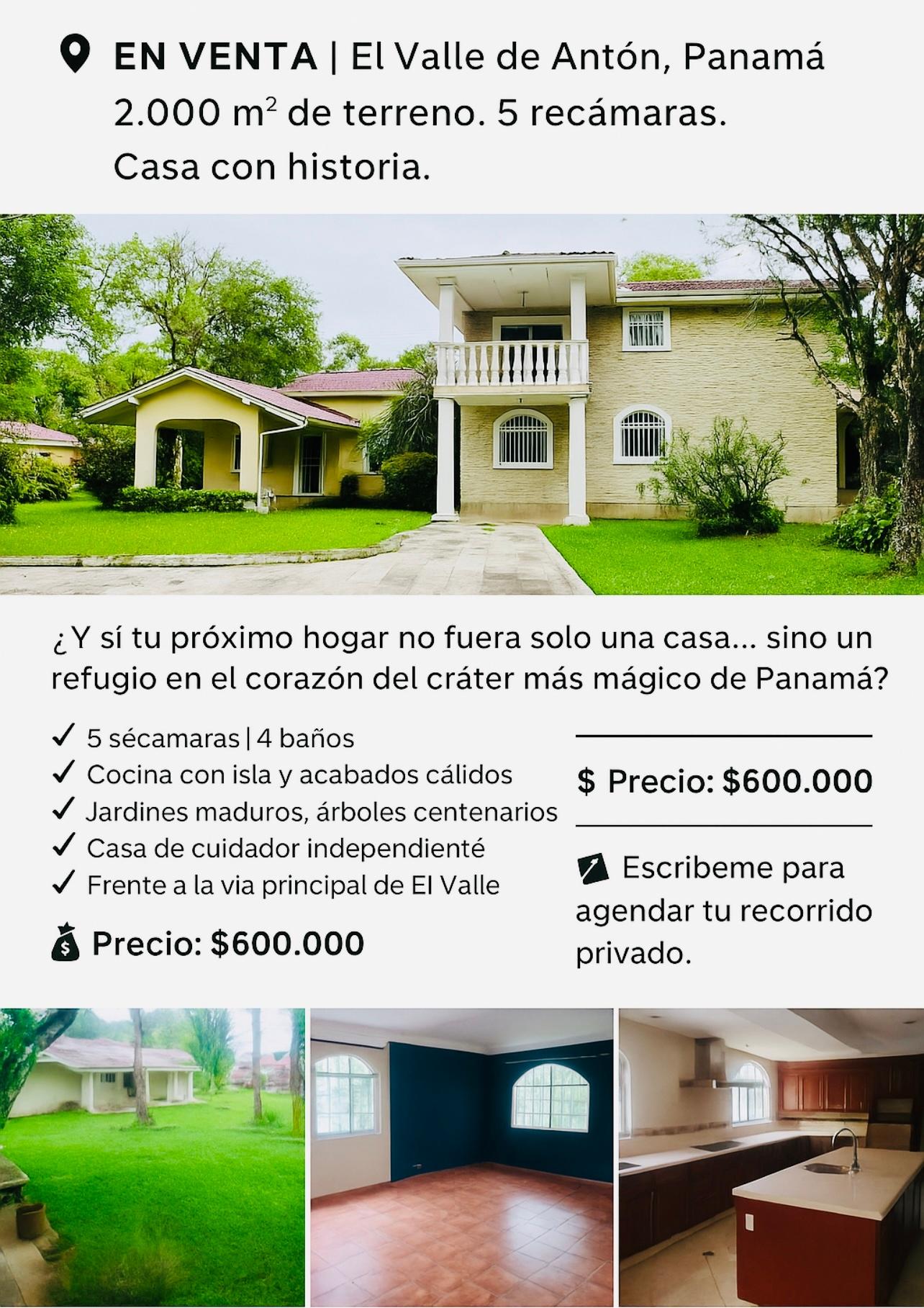 Donde el Silencio Tiene Valor Residencia Estratégica en El Valle de Antón En El Valle no se compra solo propiedad. Se adquiere tranquilidad, tradición y un estilo de vida reservado para quienes valoran la discreción y el buen vivir. Ubicada sobre la vía principal del El Valle y en un terreno plano de 2,000 m², esta propiedad combina amplitud, privacidad y múltiples posibilidades de uso. ✅ Casa principal de 5 recámaras y 4 baños ✅ Área construida aprox.: 376 m² ✅ Casa de cuidador ✅ Jardines con árboles maduros ✅ Portón eléctrico y acceso directo desde calle asfaltada Precio de lista: $600,000 Ideal para quienes buscan: — Un retiro de montaña con visión de futuro — Un Airbnb de lujo en zona reconocida — Un desarrollo wellness, clínica privada o marca boutique — O simplemente disfrutar cada fin de semana de aire fresco, silencio y naturaleza — como ya lo hacen muchas de las familias más tradicionales de Panamá. Solicita el dossier completo. Visitas solo con cita previa.