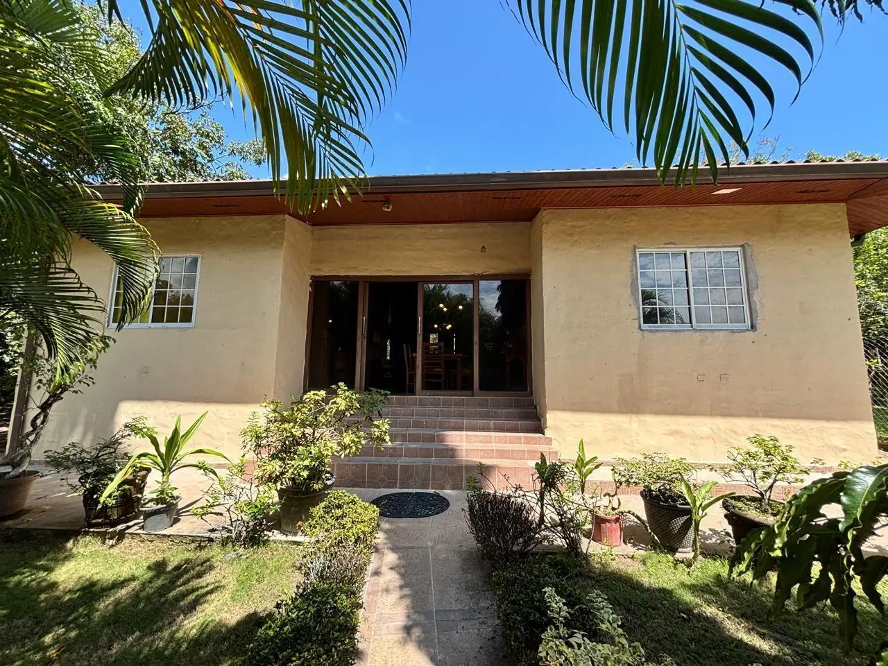 Terreno de 1,000 m 2 Piscina amplia rodeada de área verde Bellos arboles frutales y espacios para disfrutar en familia Gazebo cerrado con aire acondicionado Area de barbacoa ideal para reuniones Sala comedor y cocina con excelente iluminación 3 Recamaras y 2 baños Estacionamiento y acceso rápido a la Panamericana A solo unos minutos de playas , restaurantes y comercios.