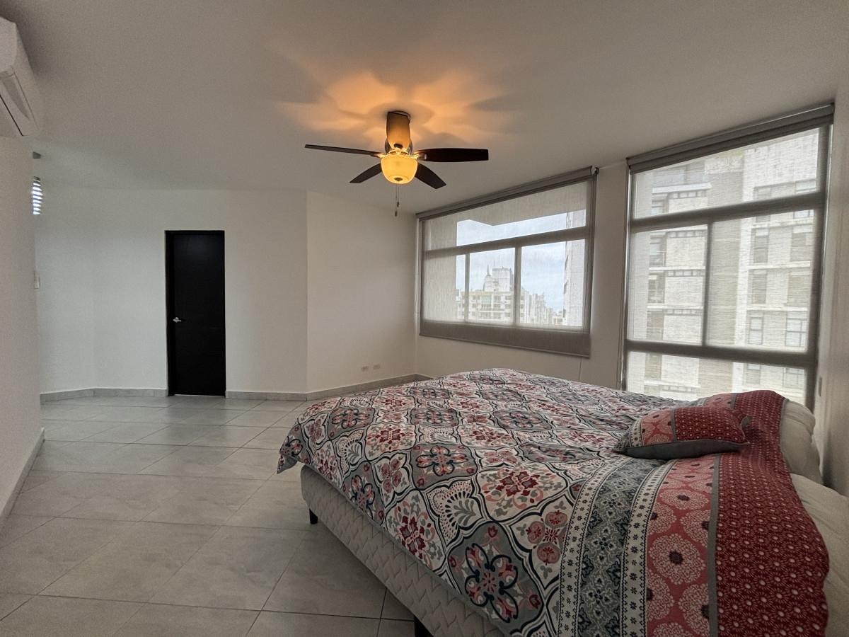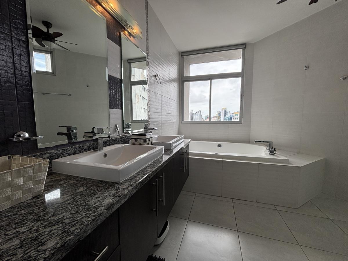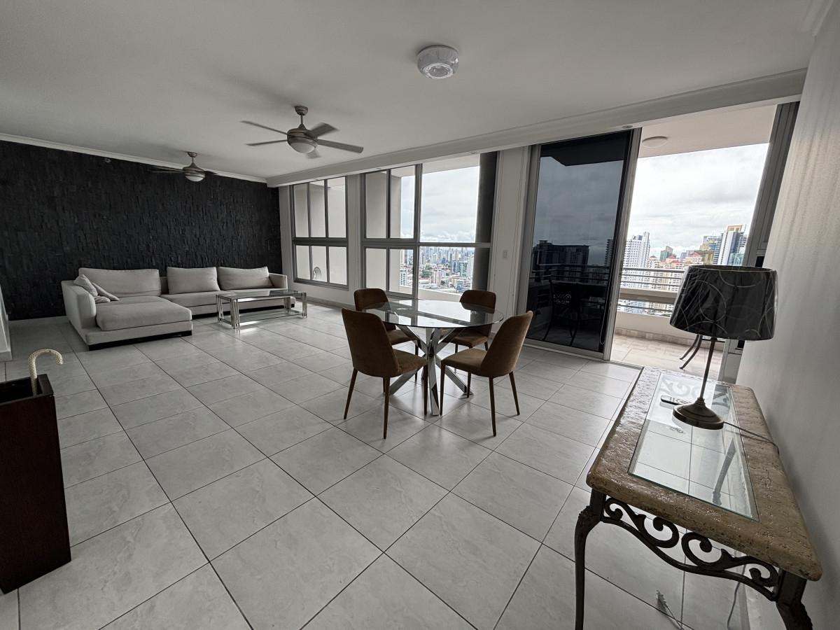 Se vende apartamento amoblado, tipo Junior Pent-house en Torre Luxor 100, El Cangrejo. Cuenta con tres especiosas recámaras, cada una con su baño, cuarto y baño de servicio, baño de visita y espectacular vista a ciudad. Los baños son amplios con finos y modernos acabados. El apartamento viene equipado con aires, cortinas, línea blanca (dos neveras), centro de lavado y lavaplatos. Adicionalmente, incluye bar con nevera para vinos y un hermoso mueble de madero hecho a la medida en el foyer del apartamento. La cocina es amplia, moderna e incluye desayunador. Luxor es reconocido como uno de los mejores y más exclusivos complejos de edificios de El Cangrejo. Las áreas sociales son amplias e incluyen piscina, jacuzzi, sauna, salas de juegos, gimnasio y juegos para niños. Los apartamentos de este tipo, cuentan con acceso a un segundo área social en la azotea del edificio con hermosas vistas, jacuzzi y espacio de bar abierto para fiestas.