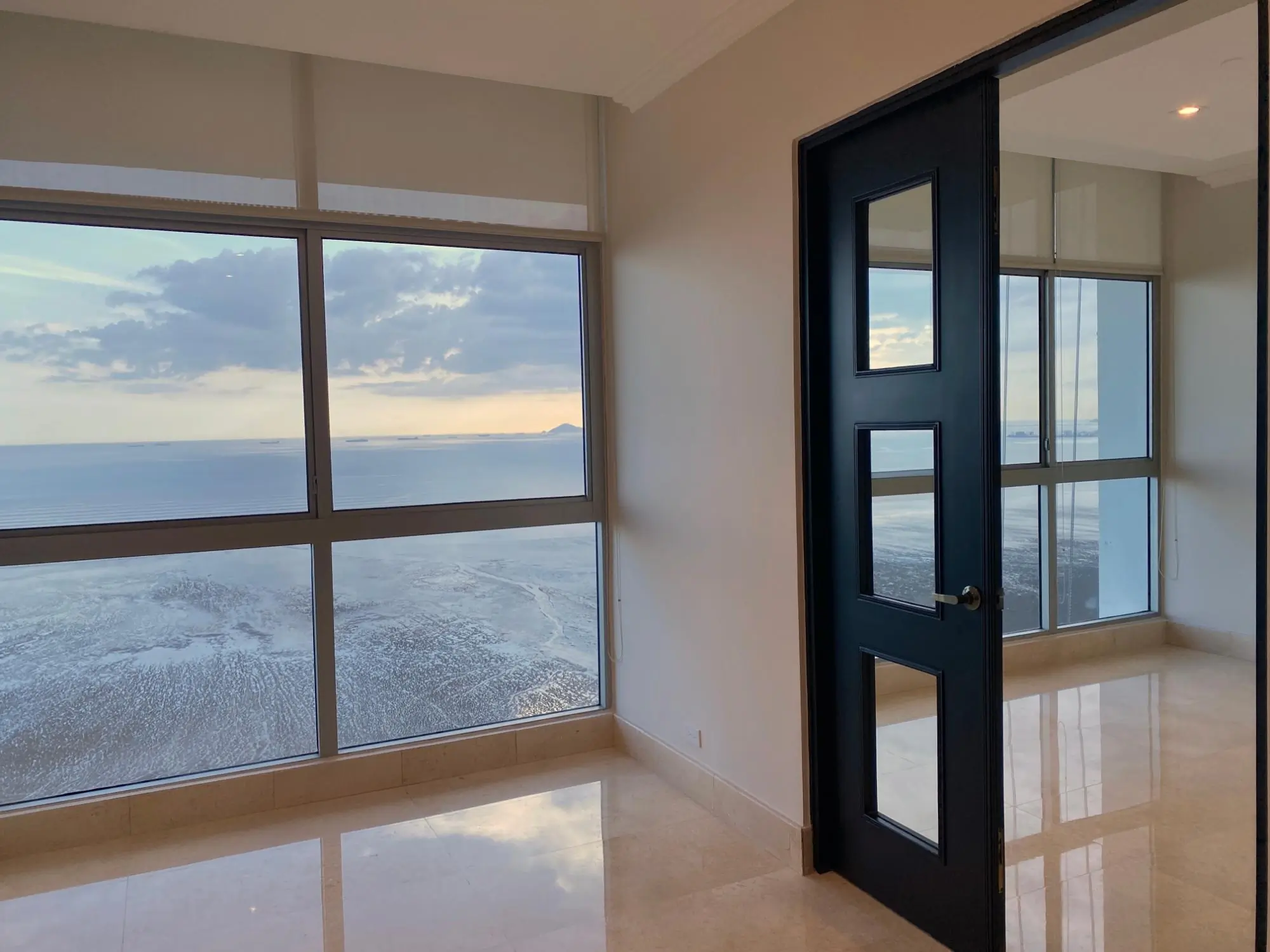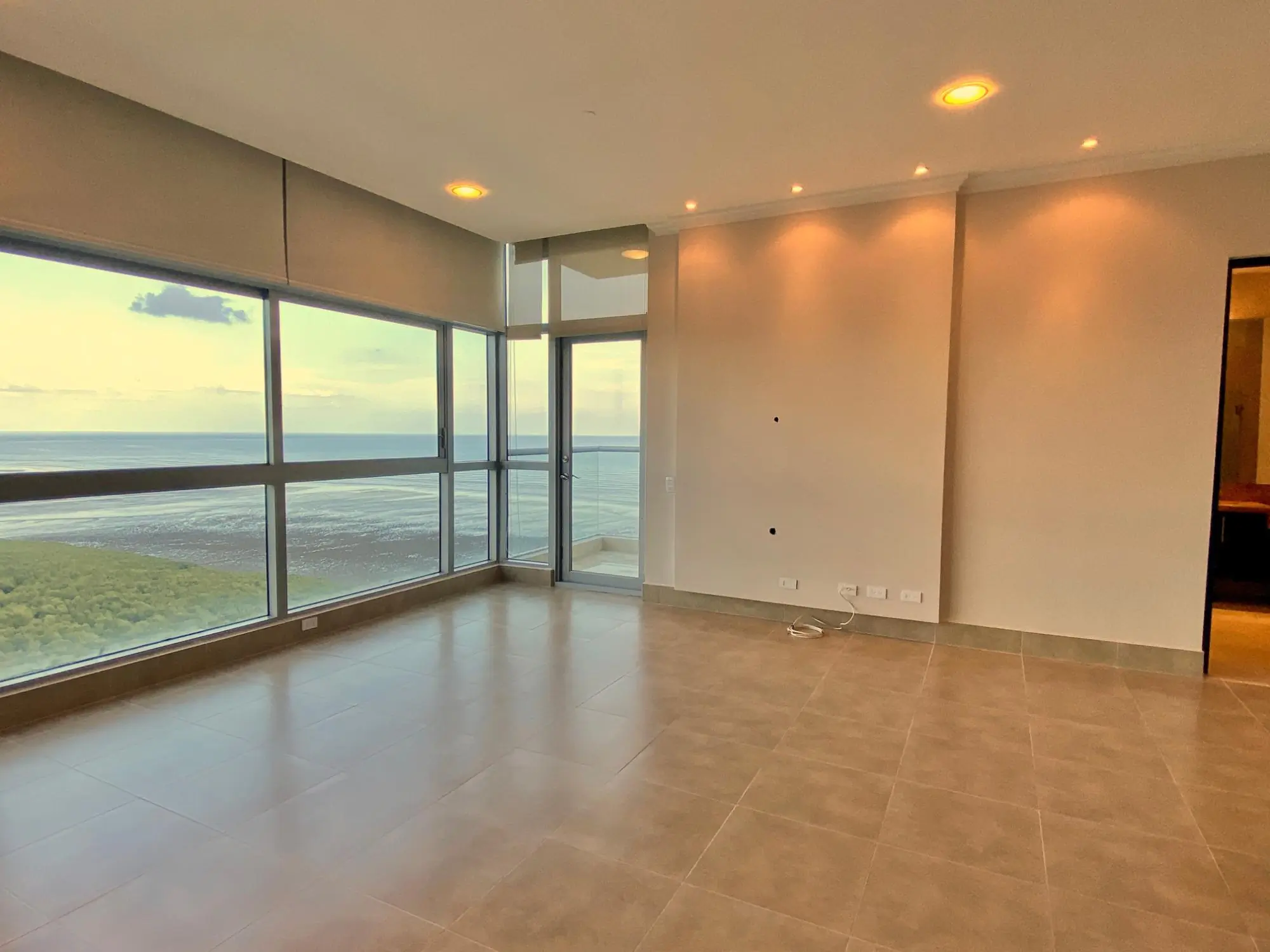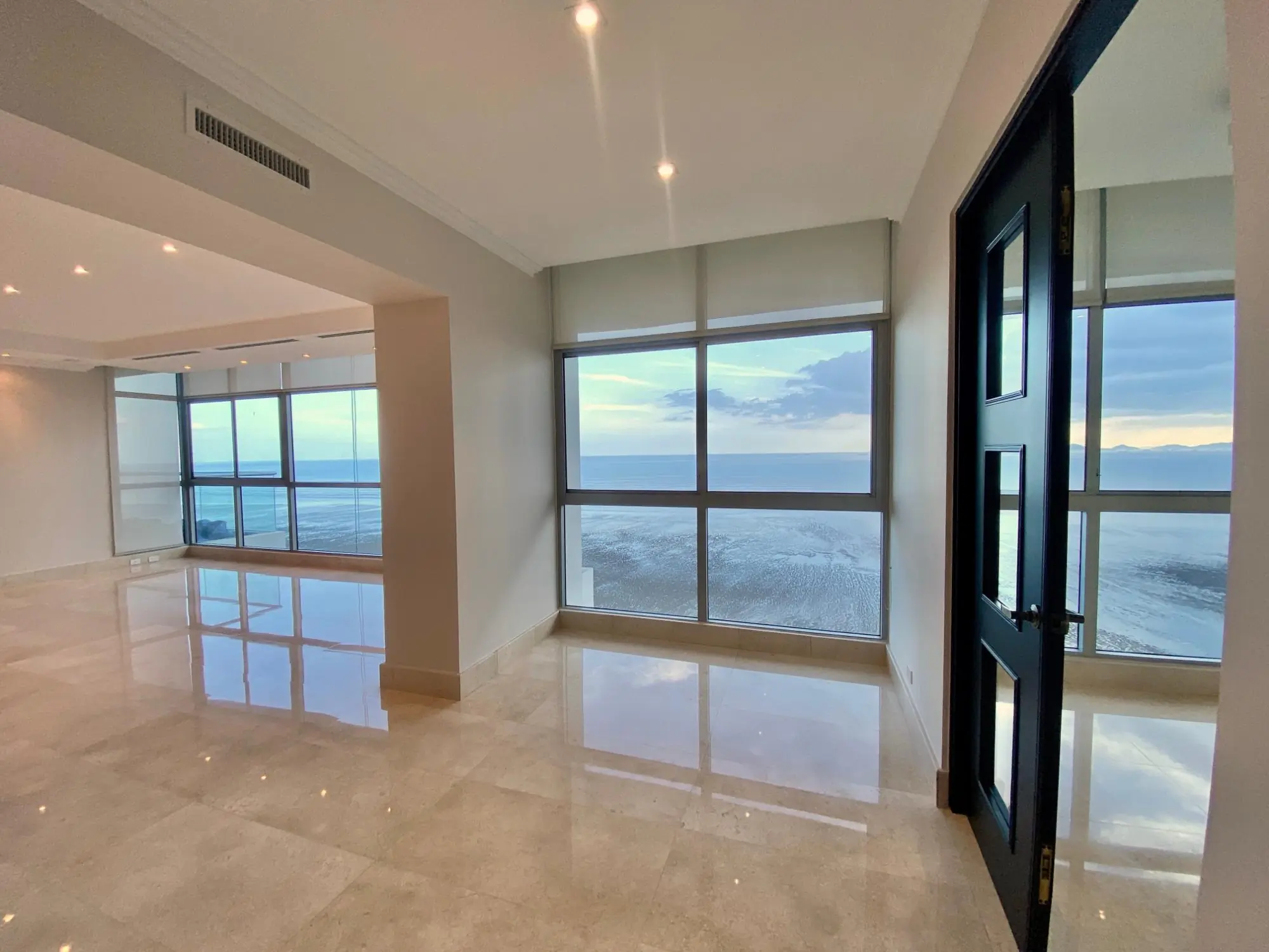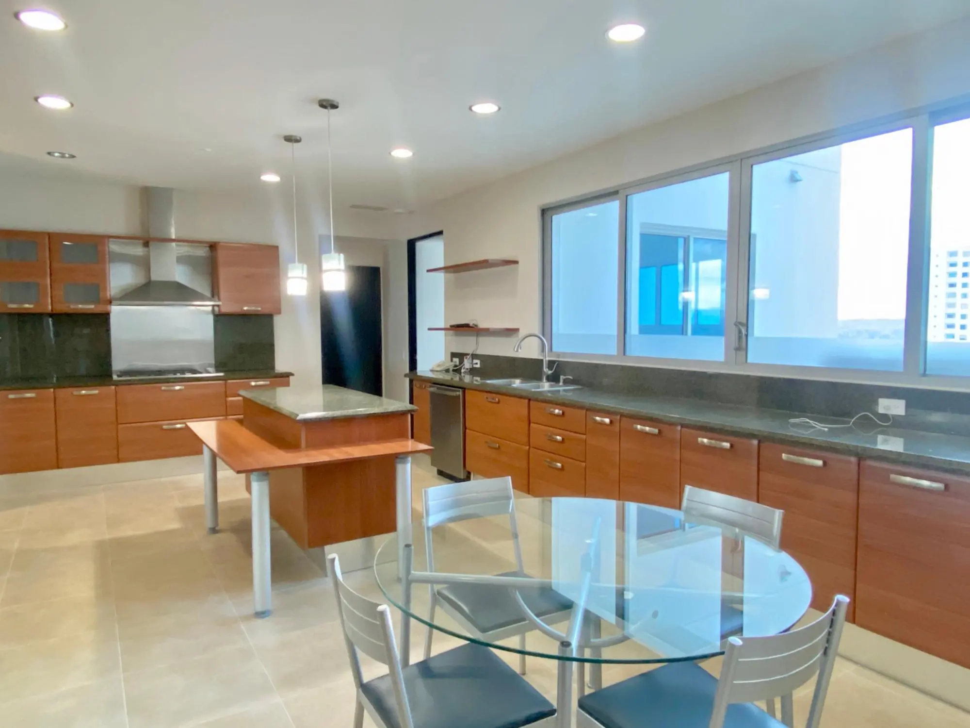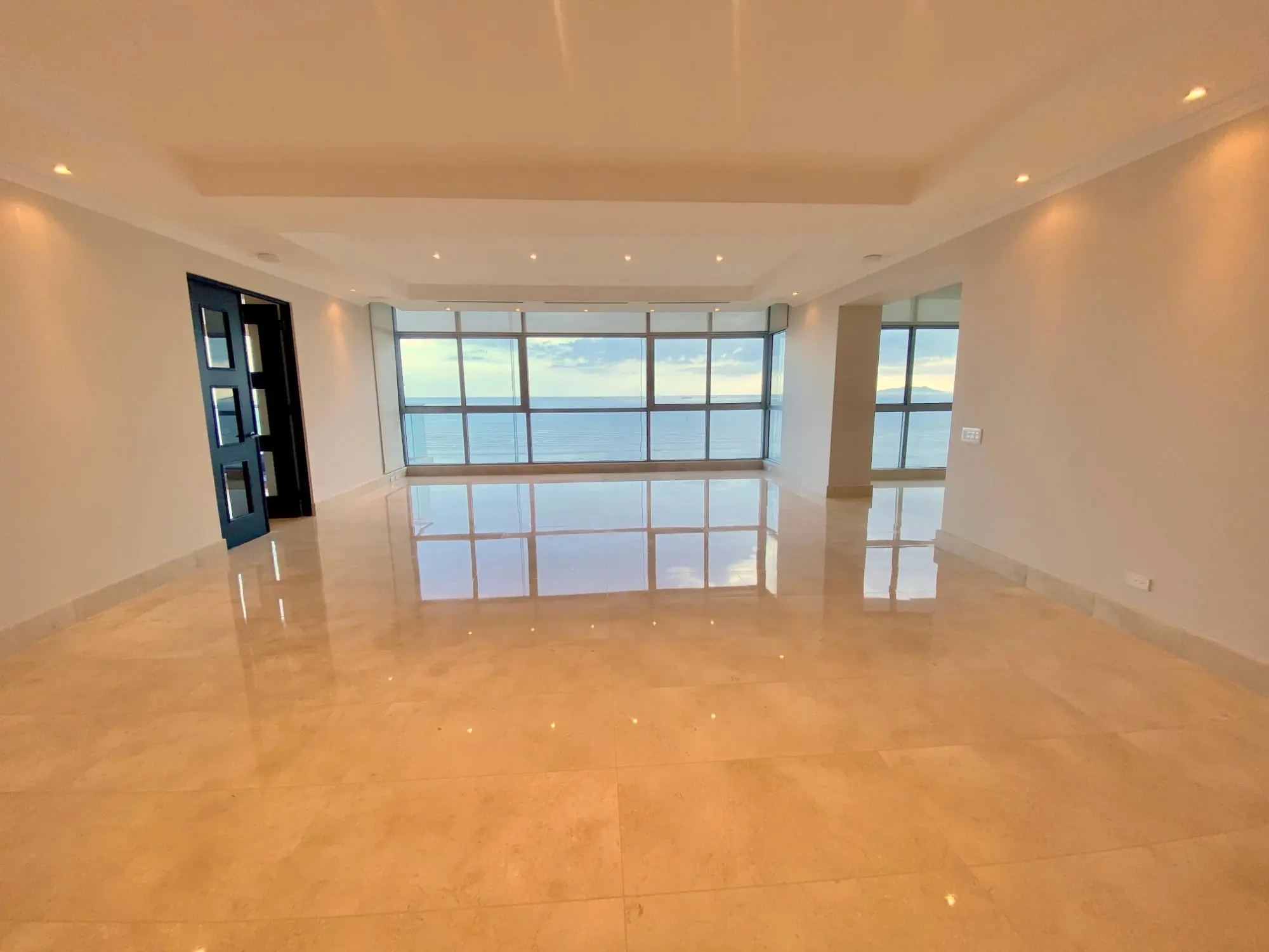 Hermoso apartamento con vistas frente al mar y hacia la ciudad, cuenta con 420m2, 3 recamaras, 3 baños completos, hall de entrada, sala, comedor, Oficina, Den con 1/2 baño, Family room, Cuarto y baño de empleada, Lavandería con muebles, Lavadora y Secadora a estrenar, Depósito: grande, 3 estacionamientos, balcón con vistas. – Sistema Inteligente integrado: WiFi, Iluminación, Sonido, A/C, y Persianas de área social y hab principal. Alarma -Línea blanca: lavaplatos nevera vino ,neveras gemelas columna horno-microondas, estufa , tiene corriente en la cocina 110/220. -Tipo de aires central: área social y dormitorios. -Tipo de aire Split: en Den, Oficina y Cocina El Edificio cuenta con Salón de Fiestas, Piscina, Gym, Parque Infantil, canchas de Paddle,área de bbq y otras amenidades/ servicios
